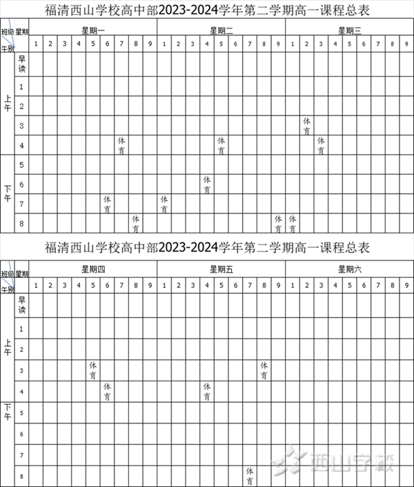 福清西山学校高中部2023-2024学年第二学期体育课课程表